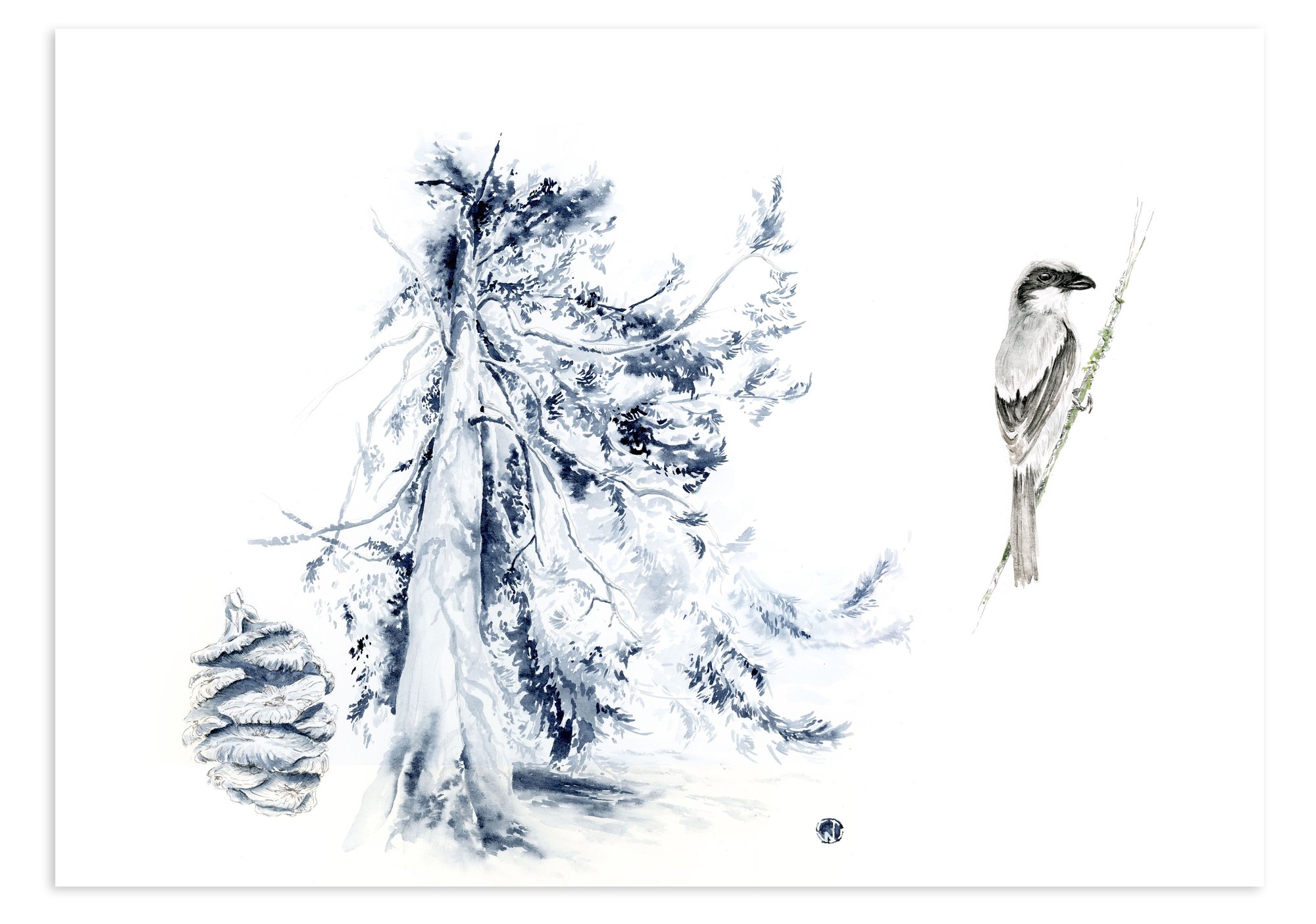 Le séquoia géant, la pie-grièche grise / 50 cm x 40 cm